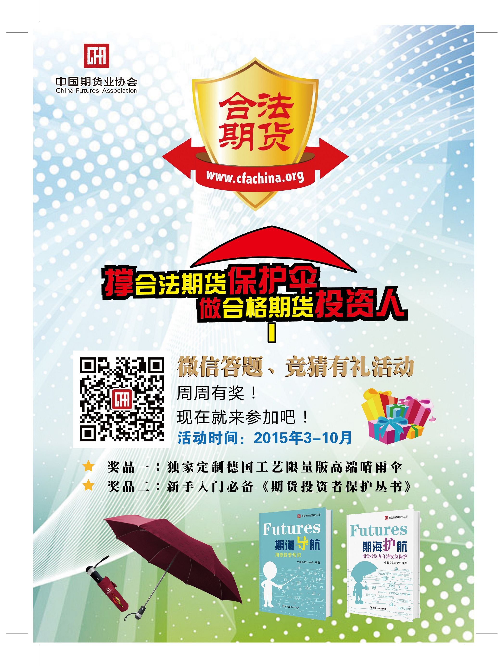 采取公眾參與、微信答題、抽取獎品為主要形式。協(xié)會官方微信設(shè)置微信答題應(yīng)用程序,參與者手機關(guān)注中國期貨業(yè)協(xié)會官方微信號“中期協(xié)發(fā)布”(ZGQHYXH)或掃二維碼即可參與答題抽獎。