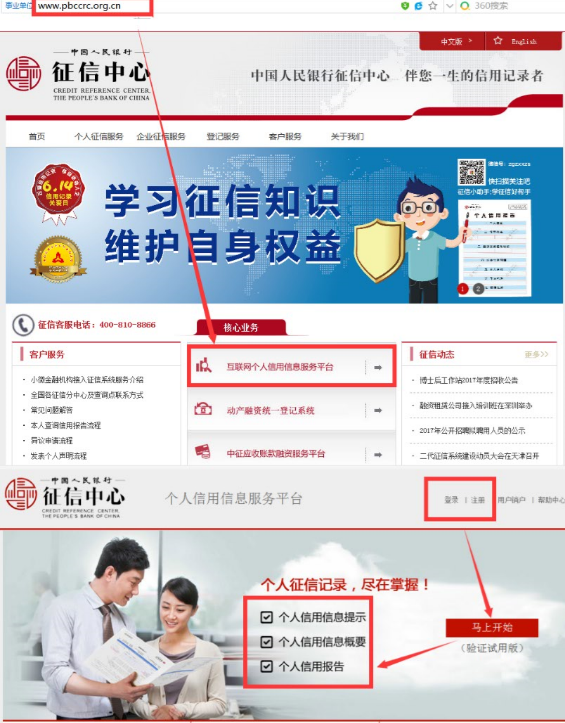 1、登錄中國人民銀行征信中心網(wǎng)址: www.pbccrc.org.cn 2、點擊互聯(lián)網(wǎng)個人信用信息服務(wù)平臺