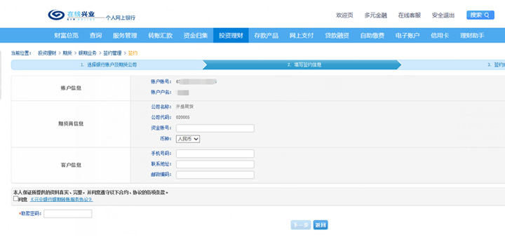 輸入期貨賬號,填寫基本信息,勾選“同意”,填寫取款密碼,點擊下一步。