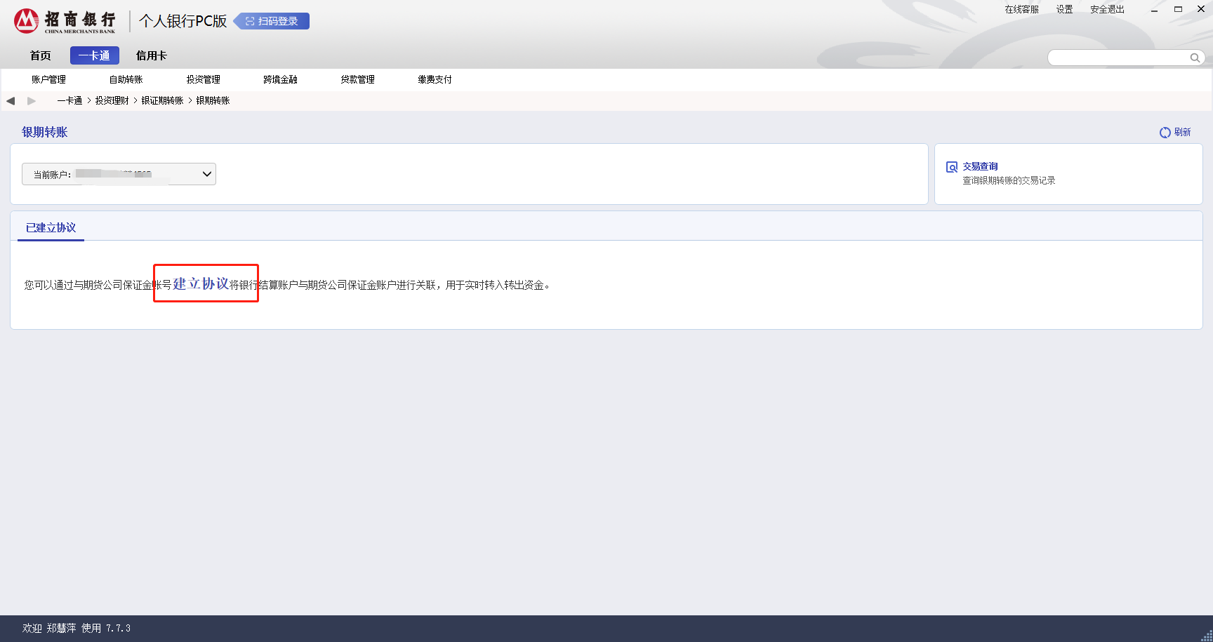 點(diǎn)擊一卡通-“投資管理“-選擇”銀證期轉(zhuǎn)賬“-”銀期轉(zhuǎn)賬“。