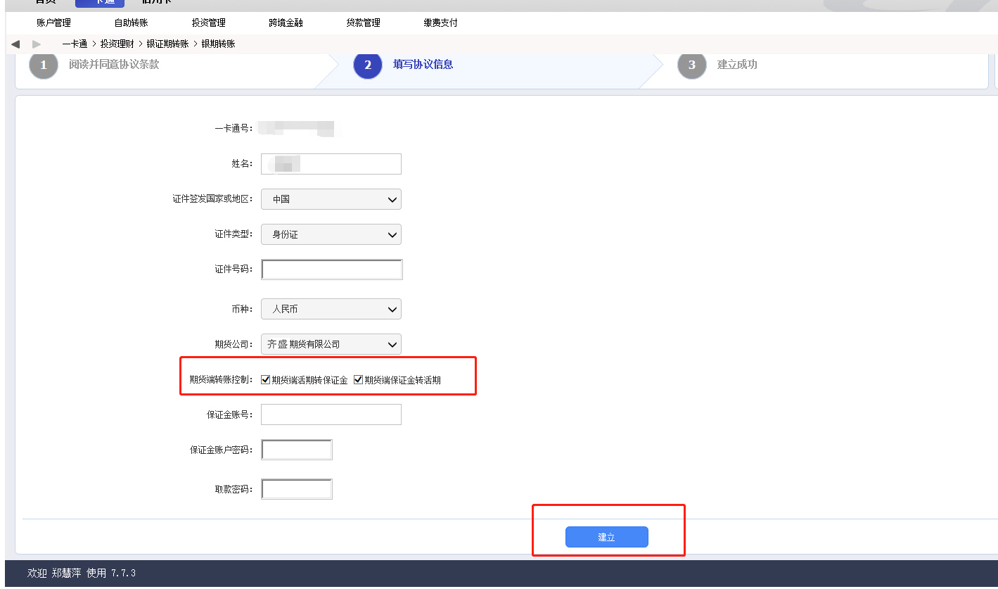 填寫(xiě)期貨公司,保證金賬號(hào),保證金賬戶密碼,取款密碼等信息后點(diǎn)“建立“。